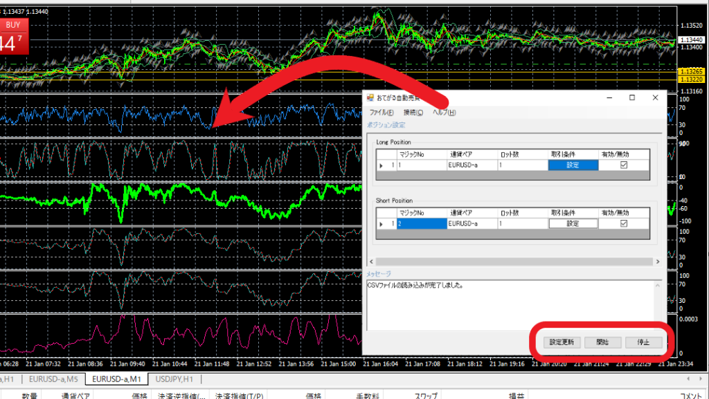 作成したEAのデータは、ボタンクリックだけで同梱のエキスパートアドバイザに反映させることができ、すぐに稼働させることが出来ます。