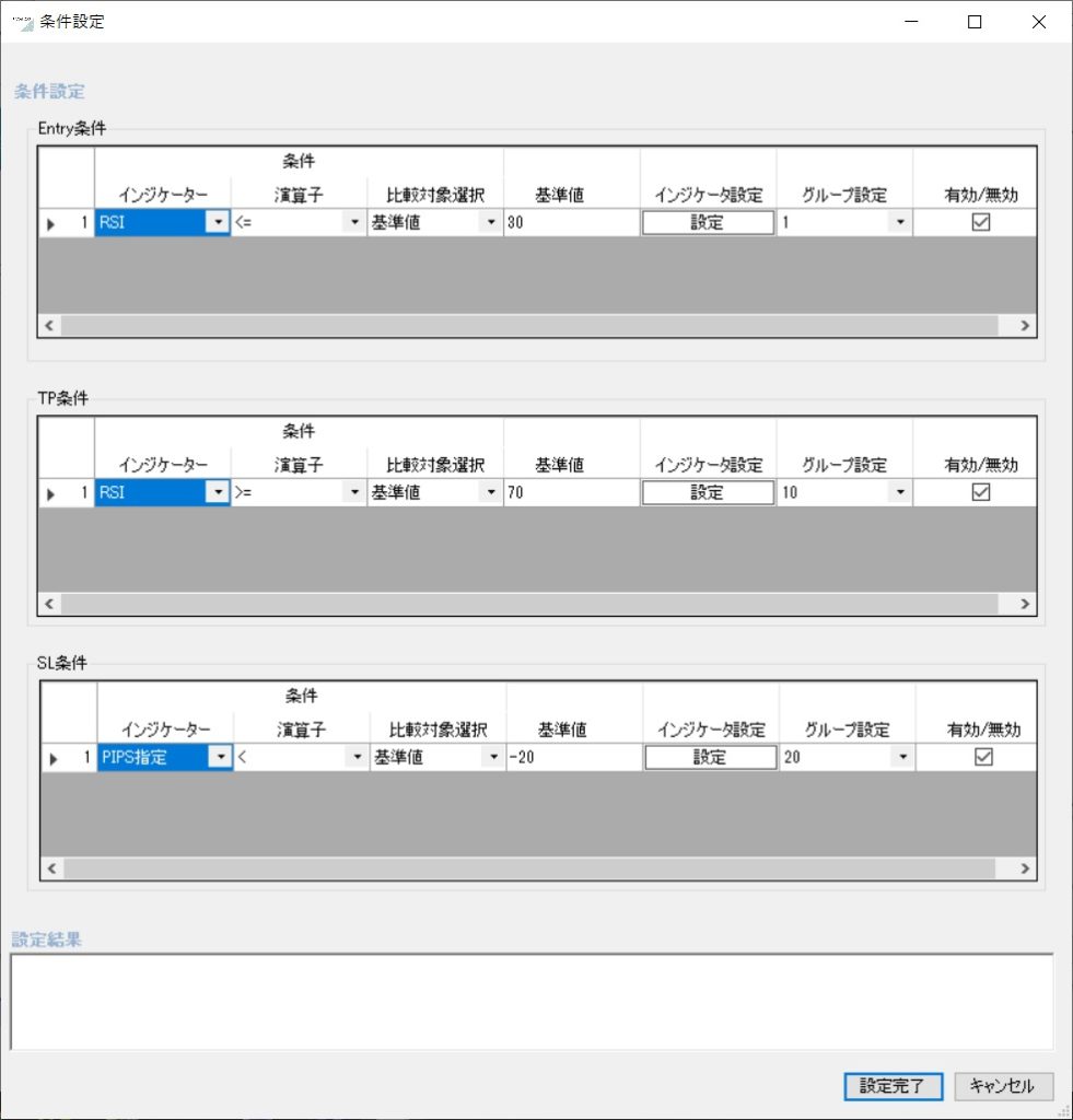 エントリー条件や、決済条件に関する下記項目の設定を行います。