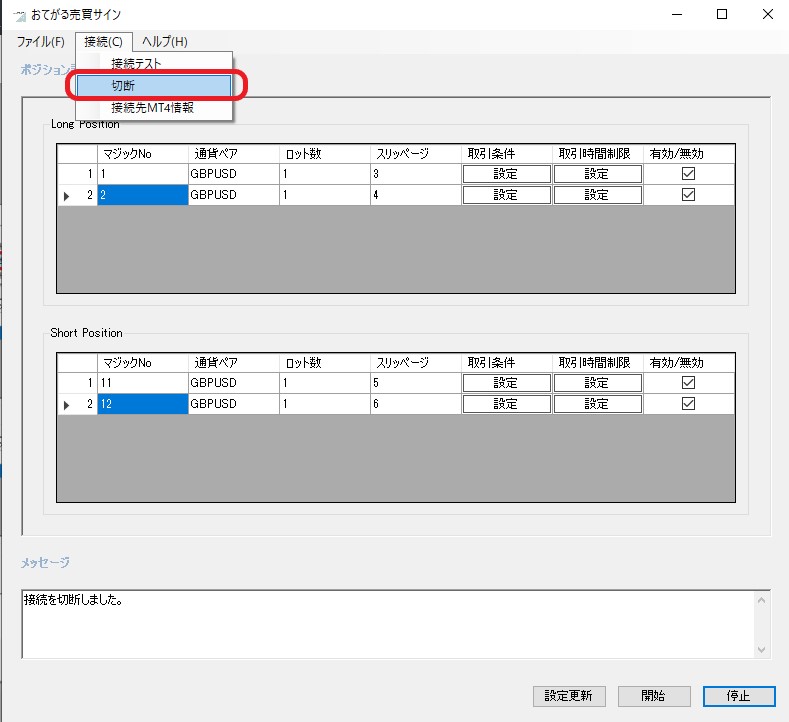 ポジション設定画面右下の『設定更新』ボタンをクリックすることで、MT4側に売買ルールの更新を通知できます。